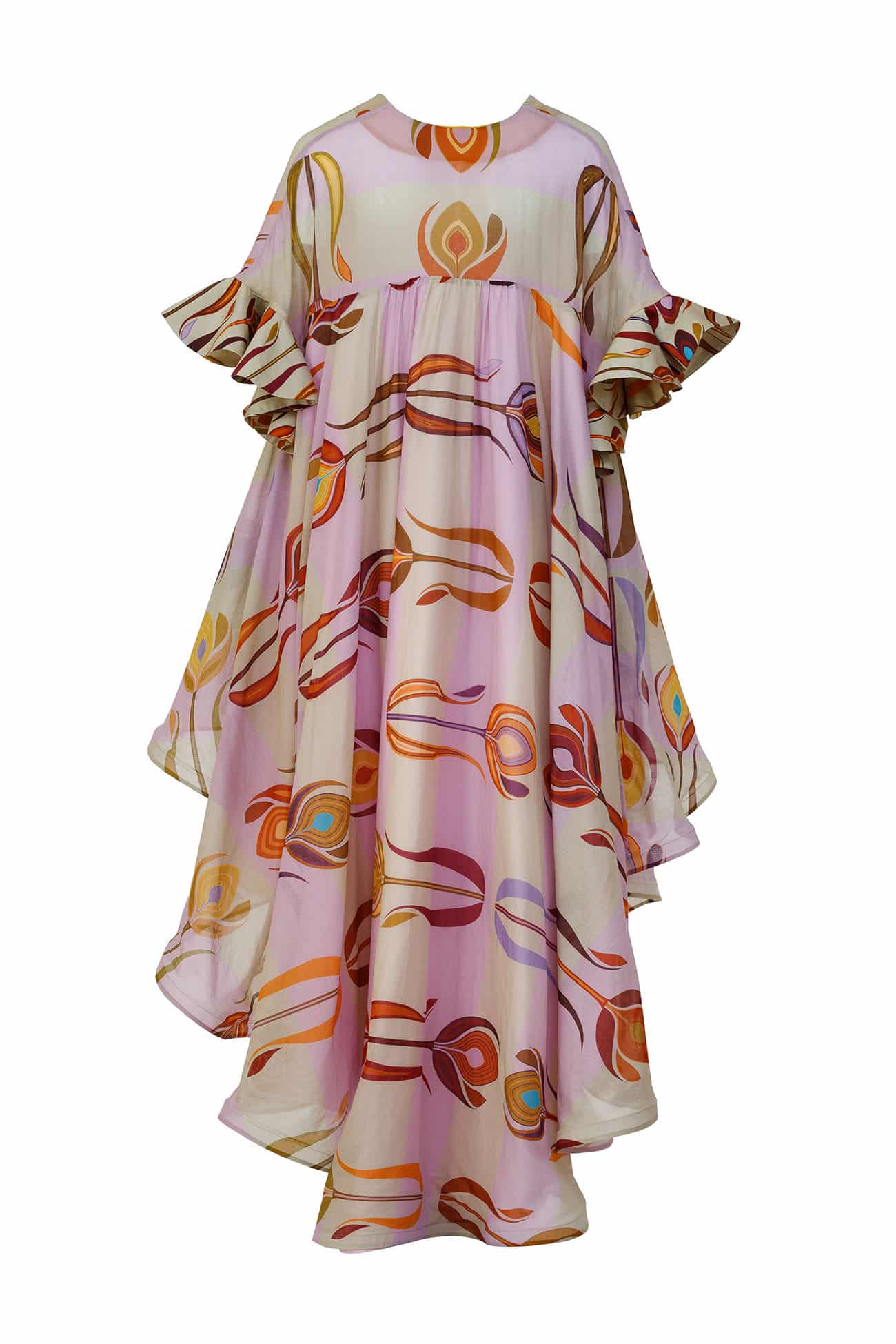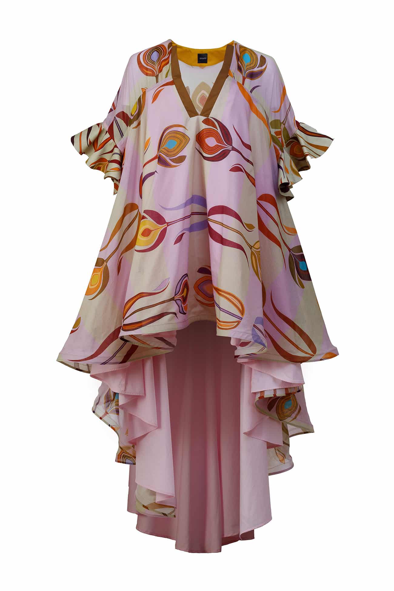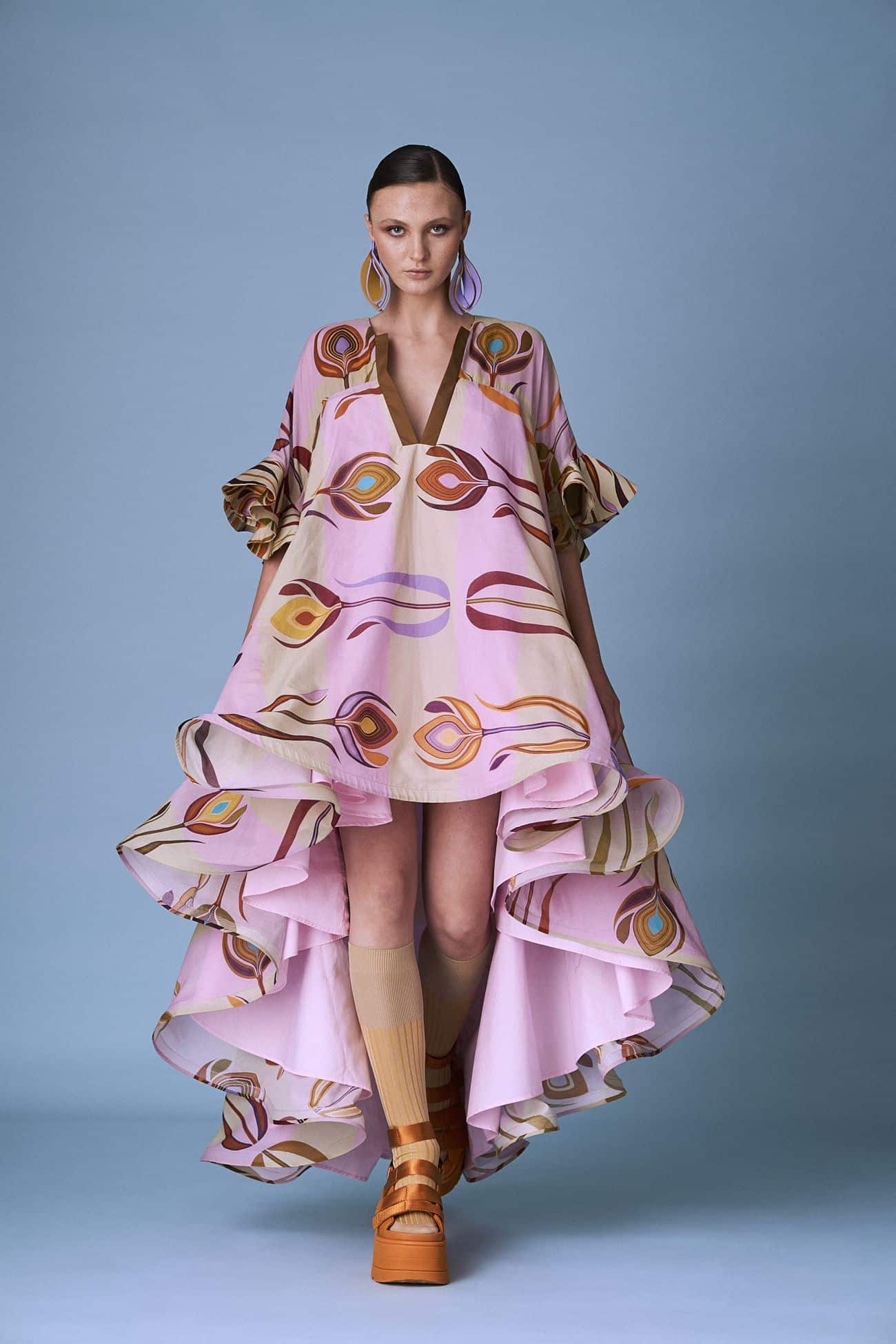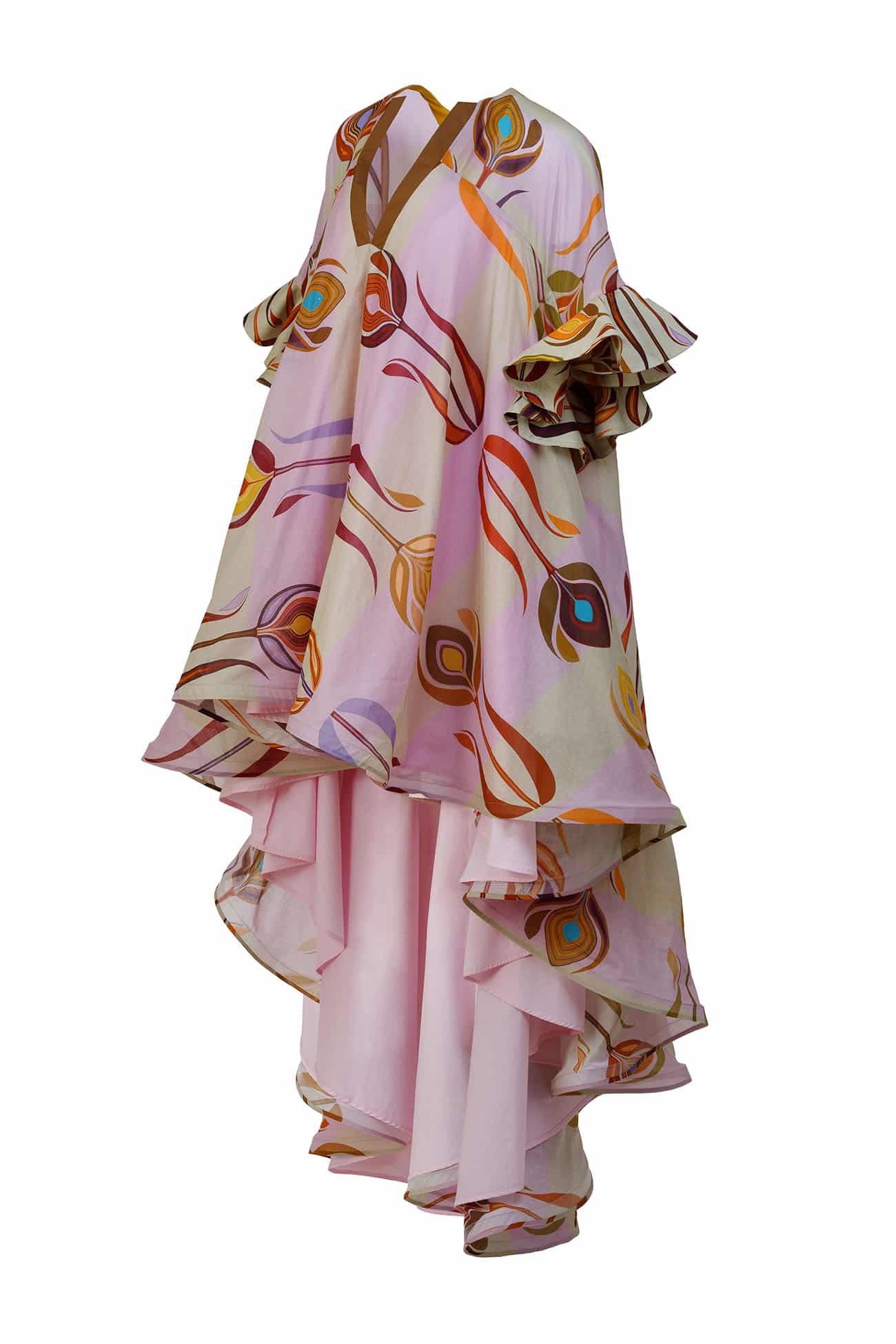 V neck printed cotton dramatic flutter sleeves dress